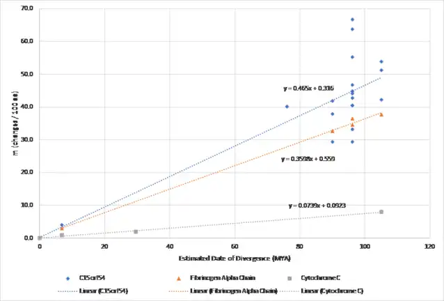 Orthologs were primarily found in primates, although many different mammals also exhibited sizeable sequence similarity to the human C15orf54 sequence. Below is a table of selected orthologs sorted by date of divergence for the C15orf54 gene, including closely and distantly related orthologs.[12][13] C15orf54 was shown to evolve relatively quickly and evenly over time with a faster rate than both Cytochrome C and Fibrinogen Alpha.