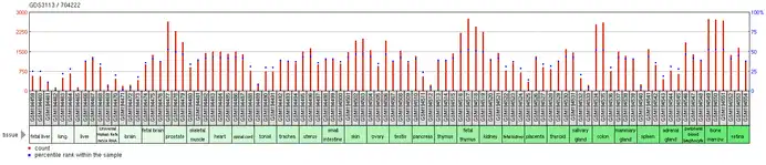 The gene has shown high expression in the prostate, thymus, appendix, bone marrow, and lungs. NCBI AceView shows that the gene is moderately expressed.[3]