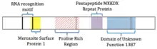 This gene contains some known domains, such as: an RNA recognition motif, a Merozoite surface protein (MSP-1), a pentapeptide repeat MXKDX, and a domain of unknown function (DUF1387). These domains could give a hint of what the function of this gene is.[6]