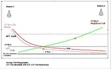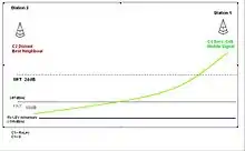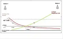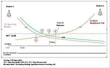 This first representation demonstrates where the slow reselect threshold (SRT), the fast reselect threshold (FRT), and propagation delay exceed parameters are most likely to be. These are represented in association with the decaying radio carrier as the distance increases from the TETRA base station.