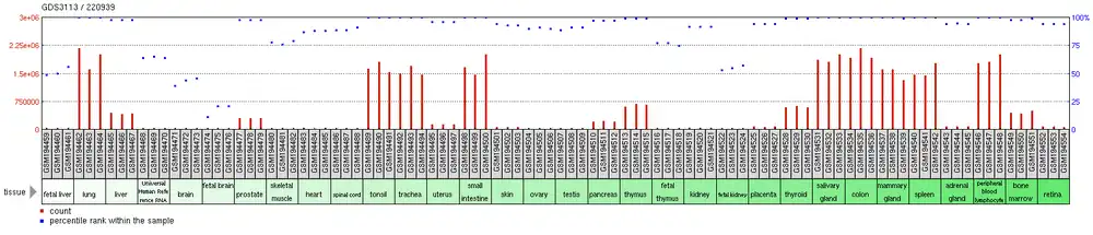 C3orf62 is expressed in more than 30 different tissues; highest expression is in whole blood.[10][7][9] Specifically, highest expression of C3orf62 is in the following tissues: lung, tonsil, trachea, small intestine, mammary gland, and salivary gland. Through analysis of various microarray studies, C3orf62 is found to have consistently high expression compared to other genes tested in the datasets.[17] C3orf62 has low expression in brain tissues.