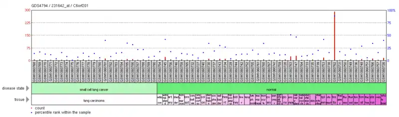 - ↑ "C6orf201 Small cell lung cancers - Homo sapiens". National Center for Biotechnology Information Search database. Retrieved 9 May 2015.