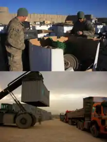 Top: Soldiers of the 18th CSSB sifting through items at the FOB Shank redistribution yard. Bottom: Soldiers of the 18th CSSB loading 20-foot shipping containers onto an out-bound convoy.