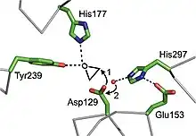 Cif is an epoxide hydrolase (EH) with unique substrate selectivity.[8] Cif is the first example of an EH serving as a virulence factor. Based on structural comparison, it appears that the enzyme utilizes a catalytic triad of residues Asp129, Glu153 and His297, with accessory residues His177 and Tyr239 coordinating the epoxide oxygen during ring opening. Cif is also the first example of an EH utilizing a His-Tyr pair to coordinate an epoxide substrate, rather than the canonical Tyr-Tyr pair.[9] In the proposed enzyme mechanism, Asp129 nucleophilically attacks a carbon of the epoxide moiety of a substrate, forming an ester linked enzyme-acyl intermediate. The preference for which carbon is attacked varies depending upon the substrate. In the second step of the reaction, a water molecule is activated by the charge-relay His297-Glu153 pair, and undergoes nucleophilic attack on the Cγ of Asp129. This hydrolyzes the ester group, liberating the hydrolysis product as a vicinal diol.[8]