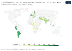 - ↑ World map of COVID-19 vaccine doses administered per 100 people by country. From Our World in Data. Chart tab has timeline graph of doses administered per 100 people by country and also the world.