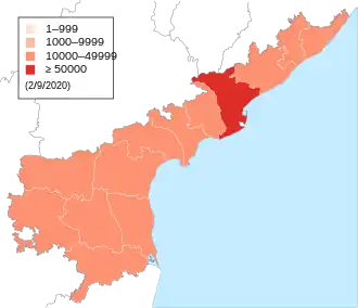 The first case of the COVID-19 pandemic in the Indian state of Andhra Pradesh was reported in Nellore on 12 March 2020. A 24-year-old who was confirmed positive for coronavirus. He had travel history to Italy.[1] The Andhra Pradesh Health department has confirmed a total of 5,37,687 cases, including 4,702 deaths and 4,35,467 recoveries, as of 10 September.[2] The virus has spread in 13 districts of the state, of which East Godavari has the highest number of cases.[2][3]