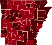 ![]() Map of the outbreak in Arkansas by confirmed total infections per 100,000 people (last updated March 2021)