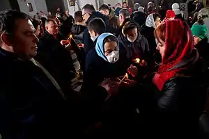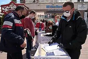 On 20 October, the 9 October country-wide facial masks mandate was lifted by the Belarusian Ministry of Health.[102] According to Deutsche Welle, that was potentially intended to act as a countermeasure to the Belarusian opposition's flash mob asking people to wear masks in public places as a part of the anti-Lukashanko protests.[103] The following crackdown on facial masks usage involved widespread removal of social advertisement promoting employment of self-protection equipment in public transport, stores and cafes.[104][105]