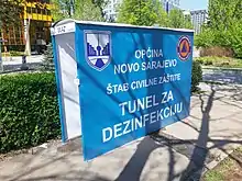 Other cities, like Cazin and Gradačac, crafted and installed disinfection tunnels, and had organised volunteer clubs, for example The Youth Crisis Staff in Cazin.[51]
