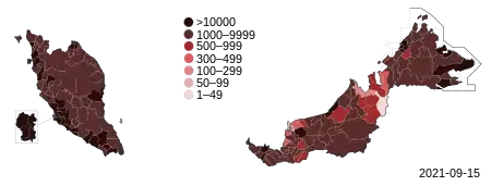At least two regional outbreaks have occurred since July 2020. In late July and August, several clusters emerged in Kedah and Sarawak.[78][79][80] In September 2020, a major outbreak in Sabah initially detected in two prisons led to a spike in community cases within that state. Following the 2020 Sabah state election, the number of cases rose across the country due to Sabah voters returning to work in other states. Malaysian authorities also attributed the surge of cases in Sabah to the entry of illegal immigrants from Indonesia.[81][82] The country passed the 10,000 cases mark on 16 September 2020, and 11 deaths, primarily in Kedah and Sabah, were reported between the month ends of August and September.[83]