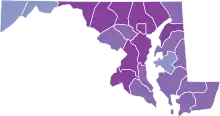 ![]() Map of the outbreak in Maryland by confirmed new infections per 100,000 people over 14 days (last updated March 2021)