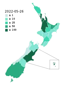 ![]() Map of cases per 100,000 inhabitants in New Zealand by district health board[lower-alpha 1] | |