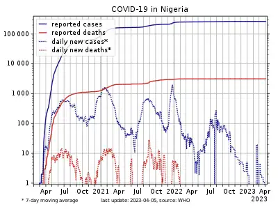 - ↑ "Nigeria: WHO Coronavirus Disease (COVID-19) Dashboard With Vaccination Data". covid19.who.int. Retrieved 2 June 2023.