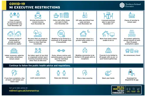 - ↑ "Coronavirus: NI to face new lockdown measures from 27 November". BBC News. Archived from the original on 19 November 2020. Retrieved 19 November 2020.