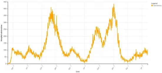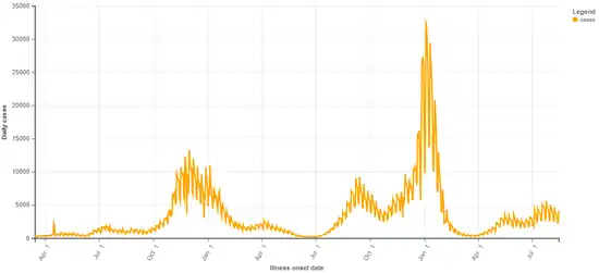 As of August 1, a total of 1,130,134 cases had been reported leading to 61,939 hospitalizations.[91] As of August 12, a total of 1,152,590 cases had been reported.[92] As of August 20, a total of 1,175,340 cases has been reported.[93] By August 27, the number of cases surpassed 1.2 million.[94]