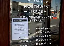 All Multnomah County Library branches were closed on March 13.[59] The library system waived late fees and continued to provide public Wi-Fi.[41]