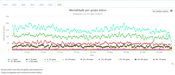 In the following two graphs, the total deaths per day and by age group are presented for the years 2019 and 2020.[73]