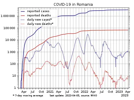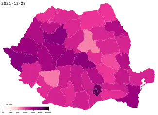 The COVID-19 pandemic in Romania is part of the ongoing pandemic of coronavirus disease 2019 (COVID-19) caused by severe acute respiratory syndrome coronavirus 2 (SARS-CoV-2). The virus was confirmed to have reached Romania on 26 February 2020, when the first case in Gorj County was confirmed.[3]