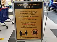 Until 17 March, the Ministry of Foreign Affairs facilitated the return to the country for 137 Romanians who were abroad, either as tourists, in transit, or in medical emergency situations and who were directly affected by the measures adopted by the states in which they were.[51] Later that same day, the government issued its first Military Ordinance, in response to the ongoing health crisis.[52] Four days later, on 21 March, a second Military Ordinance was issued: no groups larger than 3 people on the streets. Curfew from 10 p.m. to 6 a.m. All shopping centres were closed, except for the sale of food, veterinary or pharmaceutical products and cleaning services. It is forbidden for foreign citizens and stateless persons to enter Romanian territory, except through the specially organised transit corridor, further exceptions being made for other categories, such as residents, family members, and others.[53][54]