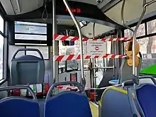 Translation: Access without a protective mask to the means of transport is prohibited. Attention! Wearing the mask in the means of transport is mandatory! Keep your social distance. For your own safety, please observe the following rules: - wearing a mask is mandatory during the trip. - keep a distance of at least 1.5 m between you in the means of transport, in the stations and at the points of sale of tickets and season tickets - please do not use the seats marked in red - please avoid congestion in the means of transport. Thank you for understanding, your health is important to us!