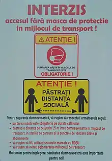 On 22 April, President Iohannis issued a press release, stating the government's intention to adopt, by mid-May, official legislation requiring citizens to wear surgical masks in public.[90] That same day, Timișoara, Romania's third largest city, made the use of both facial masks and protection gloves mandatory in enclosed public spaces, including transportation.[91] This decision came a week after Constanța, a major urban centre and one of the country's main tourist destinations, took similar measures on 15 April.[92]