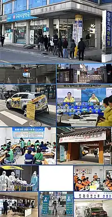 ![]() From top to bottom then from left to right: a queue in front of a pharmacy in Wonju for the distribution of masks, a drone of disinfection in Seongnam, a closed elementary school in Daegu, protest inscriptions against Shincheonji on a car, video call between members of the South Korean government, manufacturing of masks in Busan, 2020 South Korean legislative election, admission of a symptomatic patient to a hospital in Busan, portable medical negative pressure isolation stretcher in a fire station in Hoengseong County, firefighters' training in Daegu, thermal camera at the entrance to Wonju hospital, temperature check at Incheon International Airport, drive-through testing in Gyeongju. | |