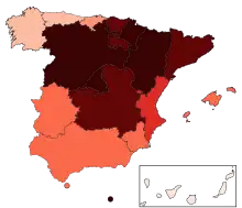 On 3 March, the second and third cases in Asturias were reported.[69][70] In the Balearic Islands a third positive case was confirmed.[71] In the Basque Country three more positives, two in Álava, and the first one in Biscay, raised the total positives to 13 for the region.[72] In Castilla–La Mancha there were four new cases reported, bringing the total up to seven, two in the province of Guadalajara and another two in the province of Toledo.[73] In the Community of Madrid 27 new positive cases of coronavirus brought the total up to 56, with five serious in intensive care.[74] In La Rioja the second case of coronavirus was confirmed.[75] In the Valencian Community, four new cases were confirmed, bringing the number of infected to 19 cases.[76] The first death in Madrid took place on 3 March but was not confirmed until 5 March.[77][78]