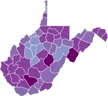 - ↑ "Coronavirus Disease 2019 (COVID-19)". Page 5 of 6, Health Status of COVID-19 Positive Patients, Top 5 Counties by Total Numbers(Microsoft Power Bl): West Virginia Department of Health and Human Services. Retrieved September 8, 2020.