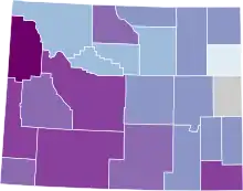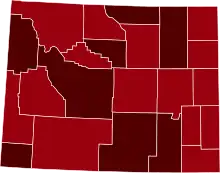 ![]() Map of the outbreak in Wyoming by confirmed total infections per 100,000 people (last updated March 2021)