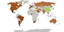 After over a month without recording any cases, the Philippines confirmed its first local transmission on March 7, 2020.[9][10] Since then, the virus has spread to the country's 81 provinces.[11] National and local governments have been imposing community quarantines since March 15, 2020, as a measure to limit the spread of the virus.[12] These include the Luzon-wide enhanced community quarantine (ECQ) that was implemented in March–May 2020.[lower-alpha 3][13] On March 24, President Rodrigo Duterte signed the Bayanihan to Heal as One Act, a law that granted him additional powers to handle the pandemic. This was repealed by a follow-up law, the Bayanihan to Recover as One Act, which he signed on September 11.[14]