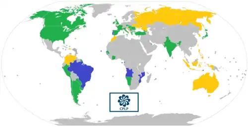 ![]() Map of CPLP member states (blue) and associate observers (green) | |