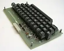 Today keyboards are readily available and inexpensive, and they have a standard interface. In 1973, new keyboards were only available to computer and terminal manufacturers. Surplus keyboards were available to hobbyists but they often produced codes other than ASCII, such as Baudot or EBCDIC. The TV Typewriter project and kit did not include a keyboard. The unit on the September cover shows a keyboard project Don Lancaster did in the February 1973 issue.[10] This project involved hand crafting 55 key-switches including fabricating the springs for each key-switch. Most hobbyists chose to use a surplus keyboard and modified it to produce ASCII codes. Don Lancaster's prototype TV Typewriter which is now on display at the Computer History Museum has a surplus keyboard with an ASCII encoder circuit that was published in the February 1974 issue of Radio-Electronics.[11] The plans for this encoder were also included in the TV Typewriter booklet