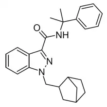 - ↑ Pulver B, Riedel J, Schönberger T, Pütz M, Schäper J, Kunert N, et al. (December 2021). "Comprehensive structural characterisation of the newly emerged synthetic cannabimimetics Cumyl-BC [2.2. 1] HpMeGaClone, Cumyl-BC [2.2. 1] HpMINACA, and Cumyl-BC [2.2. 1] HpMICA featuring a norbornyl methyl side chain". Forensic Chemistry. 26: 100371. doi:10.1016/j.forc.2021.100371. S2CID 243179410.