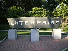 Surviving Enterprise artifacts include the ship's bell, which resides at the U.S. Naval Academy,[41] where it is traditionally rung only after Midshipmen victories over West Point; and the sixteen-foot (4.9 m), one-ton nameplate from the ship's stern, which sits near a Little League park in River Vale, New Jersey.[42] Her commissioning plaque and one of her anchors are on display at the Washington Navy Yard in Washington, D.C.