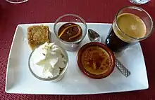 The concept of "café gourmand" was created in 1985 for the seafood chain restaurant La Criée, inspired by free mignardises offered with an order of coffee at high-end restaurants.[1][2] There are similarities between "cafés gourmands" and the English tradition of afternoon tea, although the latter is an altogether different occasion.