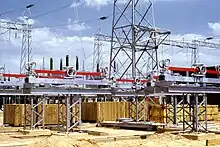 In 2006 a contract was awarded to ABB to replace the thyristor valves at the Apollo station.[4] The outdoor mounting concept was retained, but each of the new housings contains a complete six-pulse bridge instead of only two valves, and the replacement thyristor valves are of a more conventional air insulated, water-cooled design using 125mm, 8.5 kV thyristors. 36 such thyristors are connected in series in each valve, without parallel connection, and the new valves are capable of a subsequent upgrade to 600 kV, 3300 A. At the same time, the AC filters were replaced.