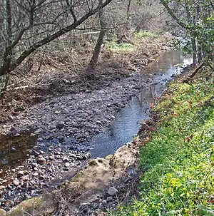 Calabazas Creek originates about 4 mi (6 km) northeast of the town of Glen Ellen, California, just north of Trinity Road, at the top of Nunns Canyon.[1] Its headwaters form from the convergence of several unnamed perennial streams.[2] It descends in a westward direction through the canyon, augmented by the waters of Nunns Iron Spring and other tributaries, and parallels Nunns Canyon Road. It emerges into the Valley of the Moon and turns southward, passing under State Route 12 at milepost 29.41.[12] It flows west of the town of Agua Caliente. As it parallels Henno Road southward into Glen Ellen, it is fed by Stuart Creek. Just after it crosses Arnold Drive, it empties into Sonoma Creek.
