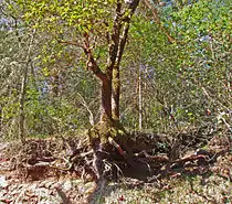 Besides the riparian habitat, the dominant plant community is the oak woodland, which has a canopy of coast live oak, Pacific madrone, Douglas fir, coast redwood and California laurel.[14] In the oak woodlands, the dominant understory plants are native toyon, blackberry and western poison-oak. Common animals observed include black-tailed deer, gray squirrel, jackrabbit, raccoon, skunk and opossum. Less frequently mountain lion are seen. There is abundant birdlife including the scrub jay, Steller's jay, acorn woodpecker, black phoebe and junco. A number of amphibians occur near the creek and its tributary elements, including the rough skinned newt, Taricha granulosa.