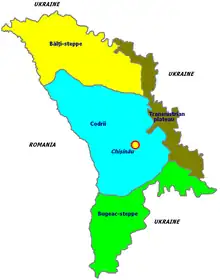 Calarasi District is located in central part of Moldova. It borders with Teleneşti District in the north, east Orhei District, Străşeni District in south, south-west Nisporeni District and Ungheni District in west. Very rugged terrain, crossed the slopes with different degrees of tilt conditioning Central Moldavian Plateau, and is located in Codri. Chernozem soil in valleys, and brown soil on the plateau. Maximum altitude in the district is 400 meters, the rate reached in the south-western part of district.