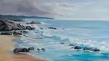 He has been featured in the New Zealand media numerous times, particularly for the generous support he has given to schools in the region both raising funds and introducing the pupils to landscape art.[12][13][14] Caley was also in the January / February 2016 edition of The New Zealand Artist for his distinctive landscape style.[15] In November 2016, it was announced that he would be the first artist in residence on a new ship dedicated to international wildlife and marine conservation.[16] An artwork donated to the help fund the Earthrace Conservation's new vessel Earthrace-2 is due to be auctioned at the prestigious Mossgreen-Webbs on February 28 with a guide price of $12,000 - $18,000.[17][18][19] In May 2017 while working in his studio, Hall noticed the neighbouring Loss and Grief Centre were fundraising and donated a large landscape piece for their raffle.[20]