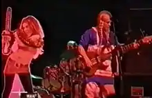 As a result of the concert removals, Mr. Bungle parodied the Red Hot Chili Peppers on Halloween 1999, in Pontiac, Michigan (the home state of Kiedis). Patton introduced each Mr. Bungle band member with the name of one of the Red Hot Chili Peppers, before covering the songs "Give It Away", "Around the World", "Under the Bridge" and "Scar Tissue", with Patton deliberately using incorrect lyrics, such as "Sometimes I feel like I'm on heroin" and "Sometimes I feel like a fucking junkie" on "Under the Bridge".[20] Patton impersonated Kiedis by wearing a blonde wig and speaking with a lisp, and while pretending to be Kiedis, mockingly said to the crowd: "Don't you call me Mike, my name is Anthony. How dare you make that mistake. Mike has been ripping me off for many years."[20] The other members of Mr. Bungle, amidst their on-stage antics, satirized many of the mannerisms of the band and simulated heroin injections, as well as mocking deceased guitarist Hillel Slovak and deceased friend of the band River Phoenix. In between "No One Knew They Were Robots" and "The Air-Conditioned Nightmare", Dunn (dressed as Flea) walked up to Spruance (dressed as the ghost of Hillel Slovak) and simulated injecting him with heroin, which Patton interrupted by shouting "You can't shoot up a ghost!".[20]