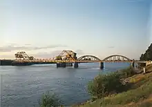 Two bascule bridges—the Paintersville Bridge and Isleton Bridge—replaced the free ferries in 1923, and are of a type patented by Joseph B. Strauss, who went on to design the Golden Gate Bridge.[16][17] Local businessmen Aven Hanford and Oscar Klatt replaced the toll ferry with the tolled Antioch Bridge in mid-1926,[18][19] almost a year before they opened the larger Carquinez Bridge to the west.[20] The counties of Contra Costa and Sacramento organized a joint highway district in November 1925 to fund an improvement of the northern approach from Rio Vista;[21] the concrete highway was completed in July 1927, creating a fully paved continuous route between Sacramento and the bay.[22]