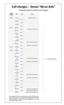 The following is the most well-known call change peal on six bells. It is the test piece for Devon Association call-change competitions, together with raising and lowering in peal before and after. The calling strategy, or plan is shown below. This means the conductor does not have to memorise the 60-plus calls, but only the overall plan. [7]