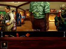 Mandel's core goals with Callahan's Crosstime Saloon were to make a title with a "strongly positive theme", in contrast to other games of the period, and to produce an adventure game that paired the "depth and playability" of text-based interactive fiction with the visuals and interface of a newer graphic adventure.[5] The optimism of Robinson's work provided the foundation for the former goal.[9] Alongside these objectives, Mandel hoped to top the animation and graphics of Legend's earlier titles, and to capture the adult attitude of Robinson's books.[10] The game was planned from the start to be character-driven; Steve Bauman of Computer Games Strategy Plus reported in 1995 that its central theme was "[r]eal people with real problems."[3] According to Mandel, Robinson's short story collections also supplied the basis for the game's episodic structure, a design decision he believed was necessary to capture the Callahan's Place style. He was hesitant to adopt the structure at first, as it was highly unconventional for a computer game.[4] By November 1995, Callahan's Crosstime Saloon was set to include 10 episodes and was planned for a mid-1996 release.[3] The number of episodes had dropped to nine by December.[10]