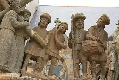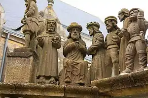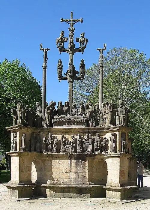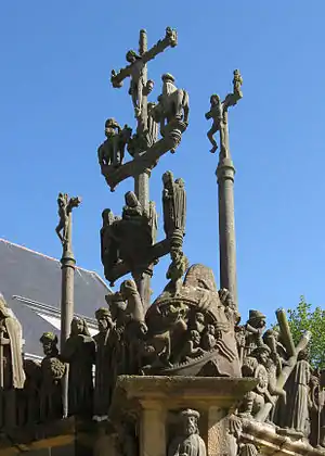 The Calvary of Plougastel-Daoulas in the arrondissement of Brest comprises a raised octagonal pedestal made from the yellow granite of Logonna-Dāaoulas, flanked by four thick arched buttresses. All the sculptural work is by the Maître de Plougastel except the horseman on the left of the crucifix which is by Millet.[1] It is a listed historical monument since 1889.[2]