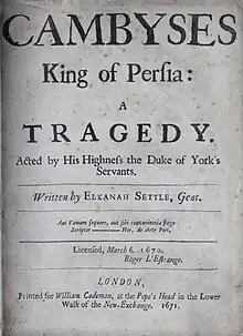 Cambyses, King of Persia is 1671 tragedy by the English writer Elkanah Settle. It was staged by the Duke's Company at the Lincoln's Inn Fields Theatre in London. The original cast included Thomas Betterton as Cambyses, Henry Harris as Prexaspes, John Crosby as Otanes, William Smith as Darius, Henry Norris as Artaban, Matthew Medbourne as Smerdis, Samuel Sandford as Parasithes, John Young as Theramnes, Mary Betterton as Mandana, Elinor Dixon as Orinda and Jane Long as Osiris.[1]