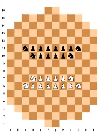 Each player begins the game with 14 pieces: four Knights and ten Men. The starting positions are: White Knights on C6, D7, I7, and J6, White Men on D6, E6, E7, F6, F7, G6, G7, H6, H7, and I6, Black Knights on C11, D10, I10, and J11, and Black Men on D11, E10, E11, F10, F11, G10, G11, H10, H11, and I11.