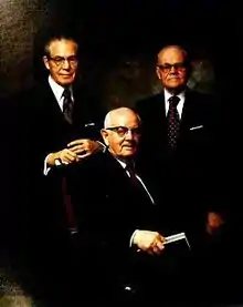 Given Kimball's history of health problems, many people—including Kimball himself—did not anticipate him living long enough to become president of the LDS Church. However, on December 26, 1973, Harold B. Lee, who was four years younger than Kimball and had previously been in much better health, unexpectedly died, leaving Kimball as the most senior apostle and thus the presumptive new church president.[65] Kimball was ordained church president on December 30, 1973, the day after Lee's funeral,[66] choosing N. Eldon Tanner and Marion G. Romney as his first and second counselors. LDS apostle Boyd K. Packer recalled shortly afterward discovering Kimball sitting alone in the church president's office quietly weeping, and Kimball saying to him: "I am such a little man for such a big responsibility!"[67]