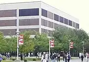 The Frank Melville Jr. Memorial Library is the main library at Stony Brook University's West Campus. It opened in 1963 and was soon expanded, more than quadrupling in size by 1971, when the building was dedicated to Frank Melville Jr., the father of Ward Melville.[8] It is located toward the eastern end of the Academic Mall and houses over two million volumes, ranging from government documents to music and film collections.[9] The building is six stories tall and the entire structure encompasses approximately 682,000 square feet of space. It is in use by over fifty different administrative and academic departments.[10] The Melville Library is also home to retail stores such as Shop Red West, a university bookstore, a Starbucks coffee shop, Amazon@Stony Brook (the first Amazon pickup location in the state of New York) and FedEx.