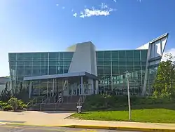 The Walter J. Hawrys Campus Recreation Center is a student gymnasium and recreation center. Located on John S. Toll Drive, the $37.5 million, 85,000-square foot building opened in 2012 after three years of construction.[91] It was dedicated to Walter J. Hawrys in 2014, whose South Shore Brick Masons company built numerous buildings on the Stony Brook campus. The recreation center averages 2,000 visitors per day.[92] Its design was praised for its "cohesive theme of horizontally and vertically stacked red, gray, gray-black and black panels appearing in everything from day lockers to glazing."[93]